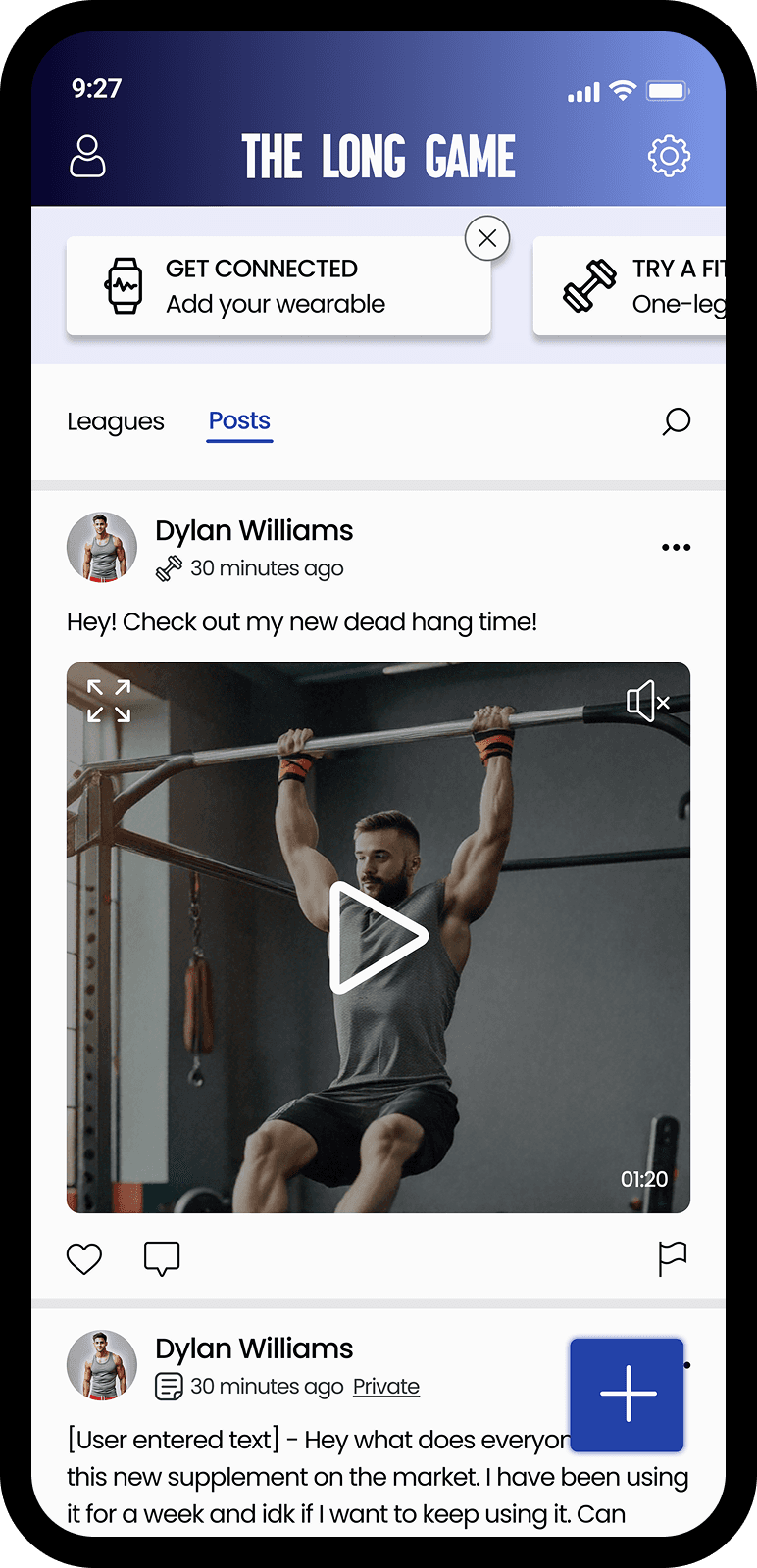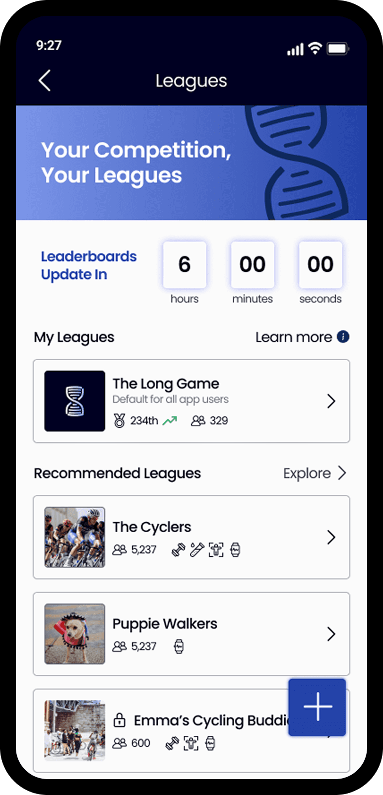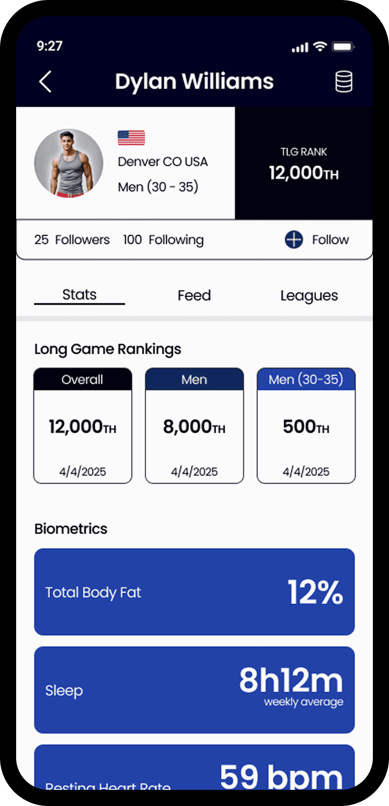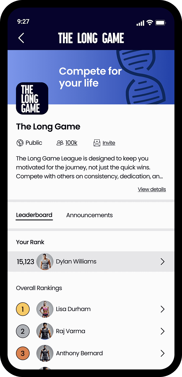 The Long Game is a community-focused health app that turns longevity metrics into friendly competition. I led end-to-end design to make complex health data engaging, social, and easy to track.