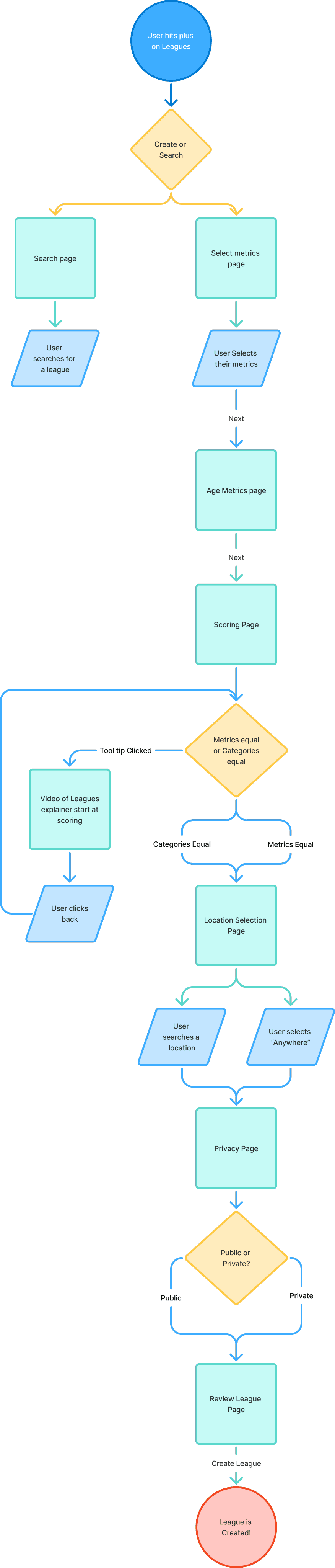 We defined user flows for each section of the app. The ones that required the most thought were data entry and creating leagues which I’ve put below.