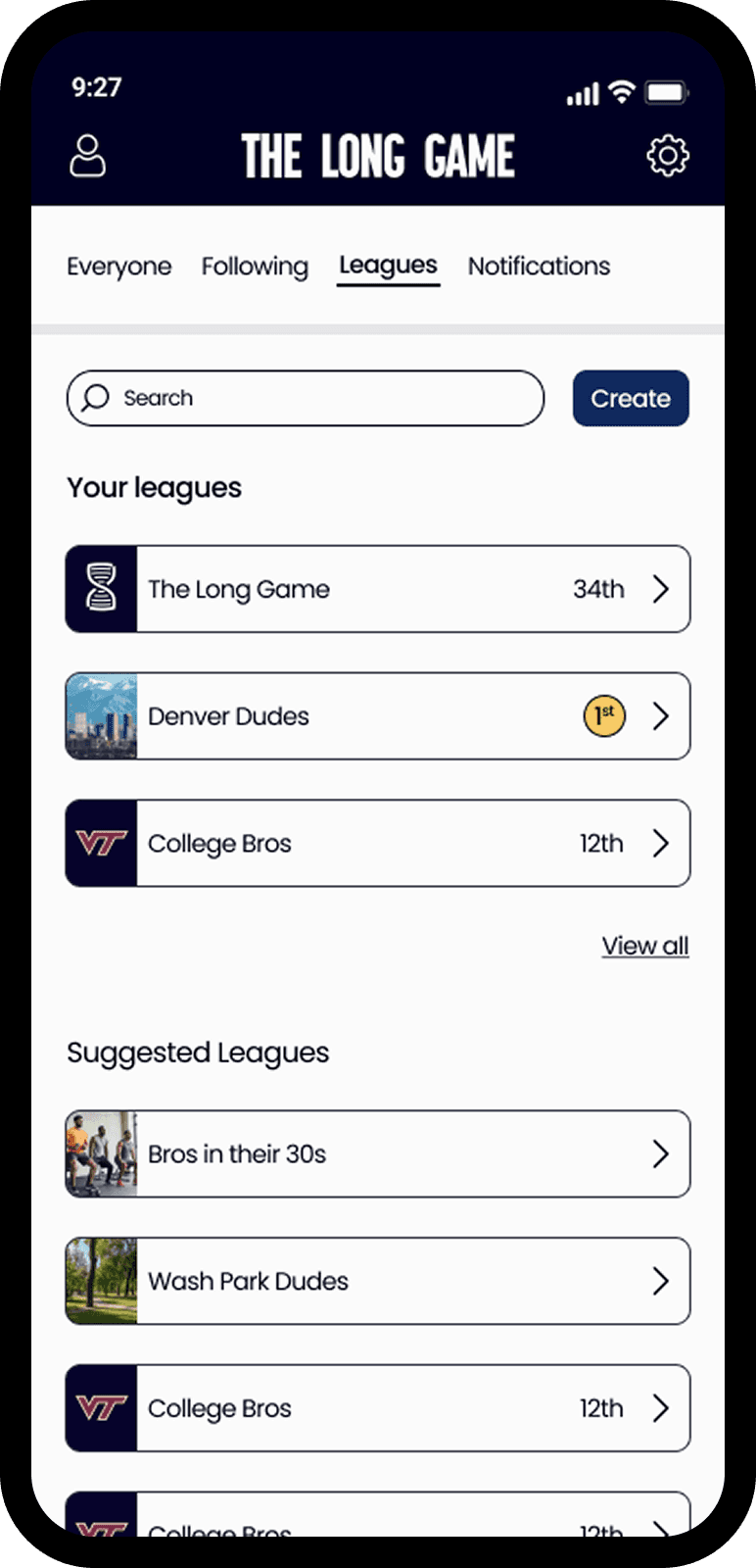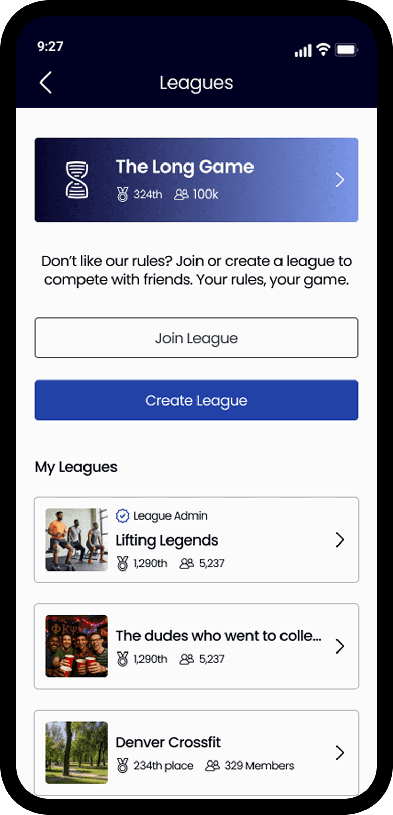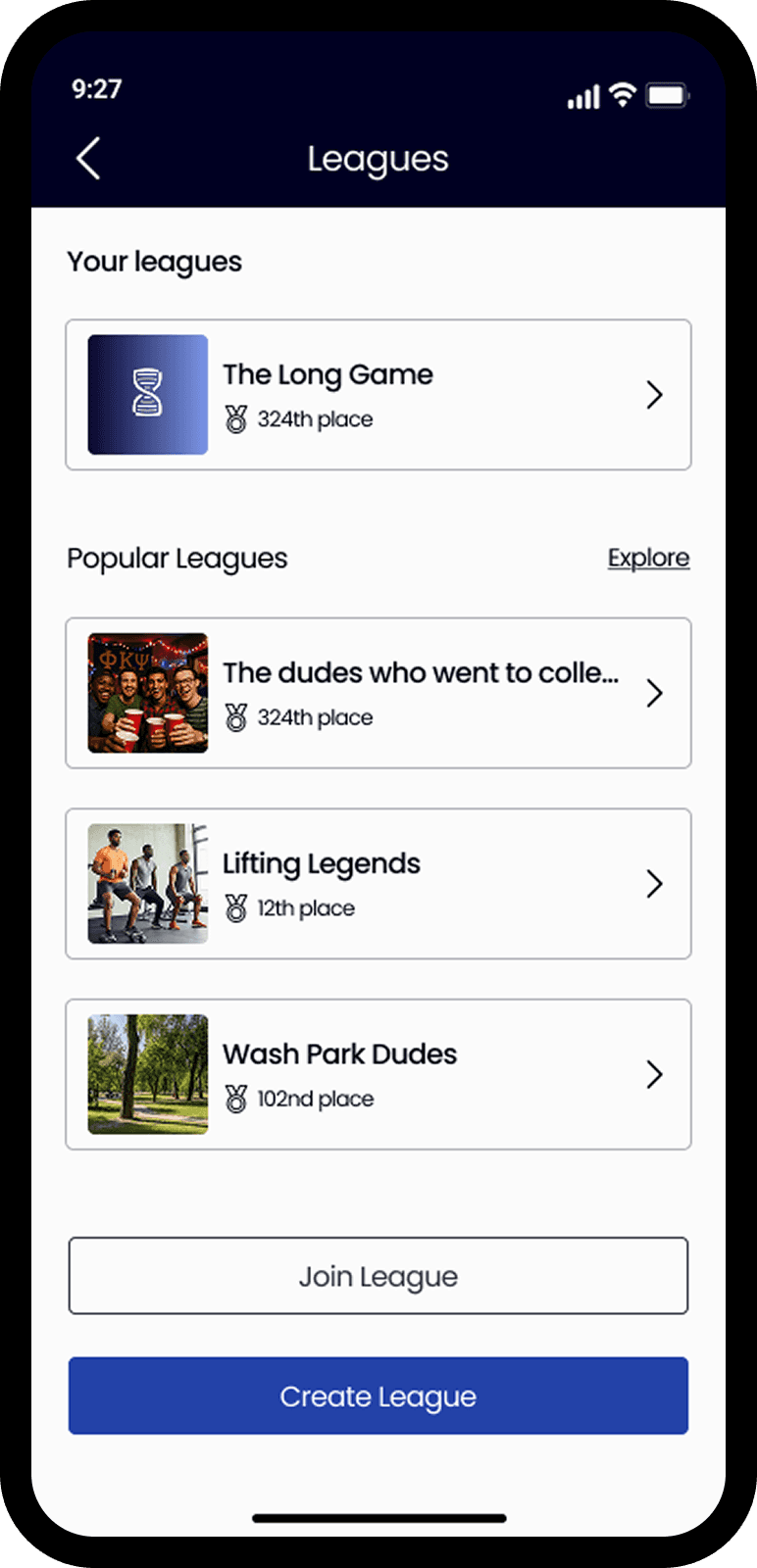 Leagues was iterated on throughout the process as there were several goals of this feature: allow users to quickly create leagues, view their standing in their league, and find more leagues to join. Additionally, a countdown clock was added to help the user understand that their rankings in leagues are not real-time, as it was not possible for a scalable development.
